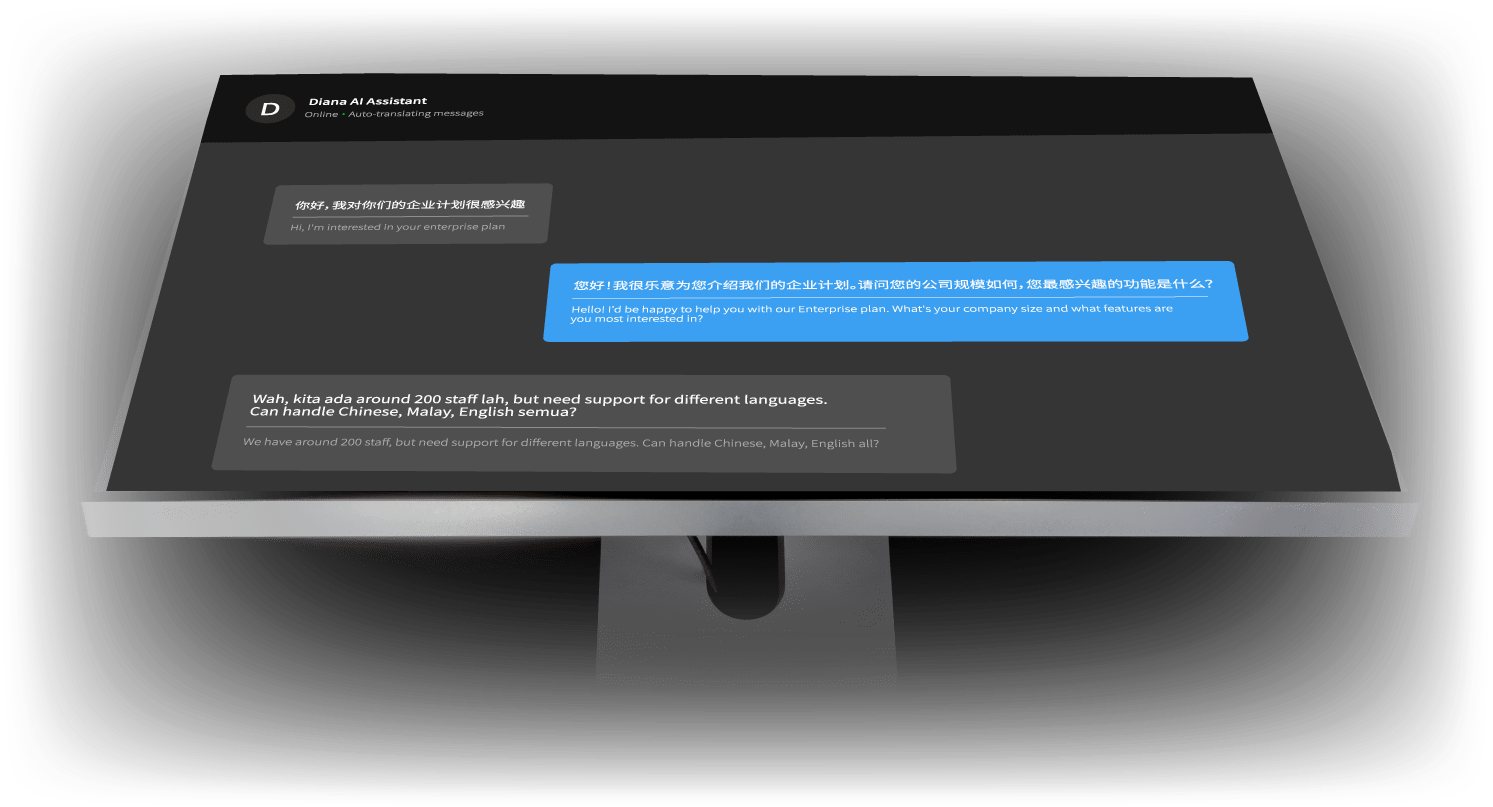 Diana speaks like your customers do. From Manglish to Khmer shorthand, from mixed Chinese-English to Malay-English code-switching — no message gets lost in translation.