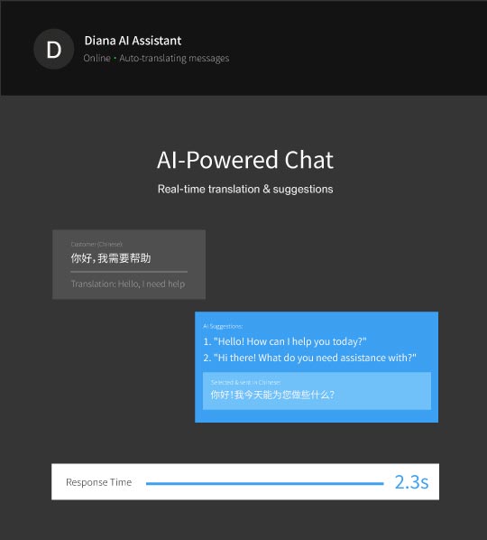 Customer writes in Chinese? Diana translates and suggests responses in Chinese. Agent types in English, customer receives in their language.